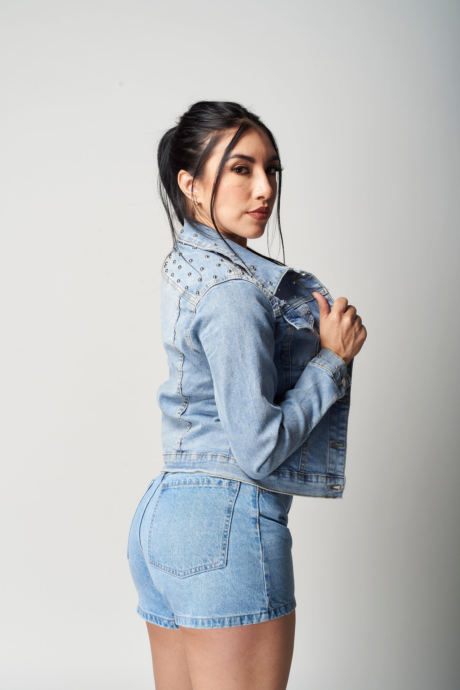 Siente el equilibrio perfecto entre comodidad, estilo y sofisticación con esta chamarra de mezclilla para mujer en tono azul claro. Confeccionada en denim elástico de alta calidad , se adapta suavemente a tu silueta sin limitar tu movimiento. Su diseño incorpora aplicaciones de perlas metálicas en el cuello, frente y espalda, logrando un efecto moderno y femenino que transforma cualquier outfit.