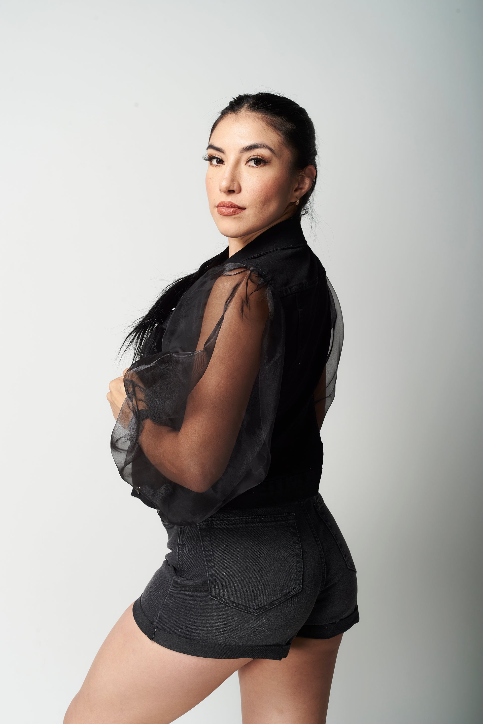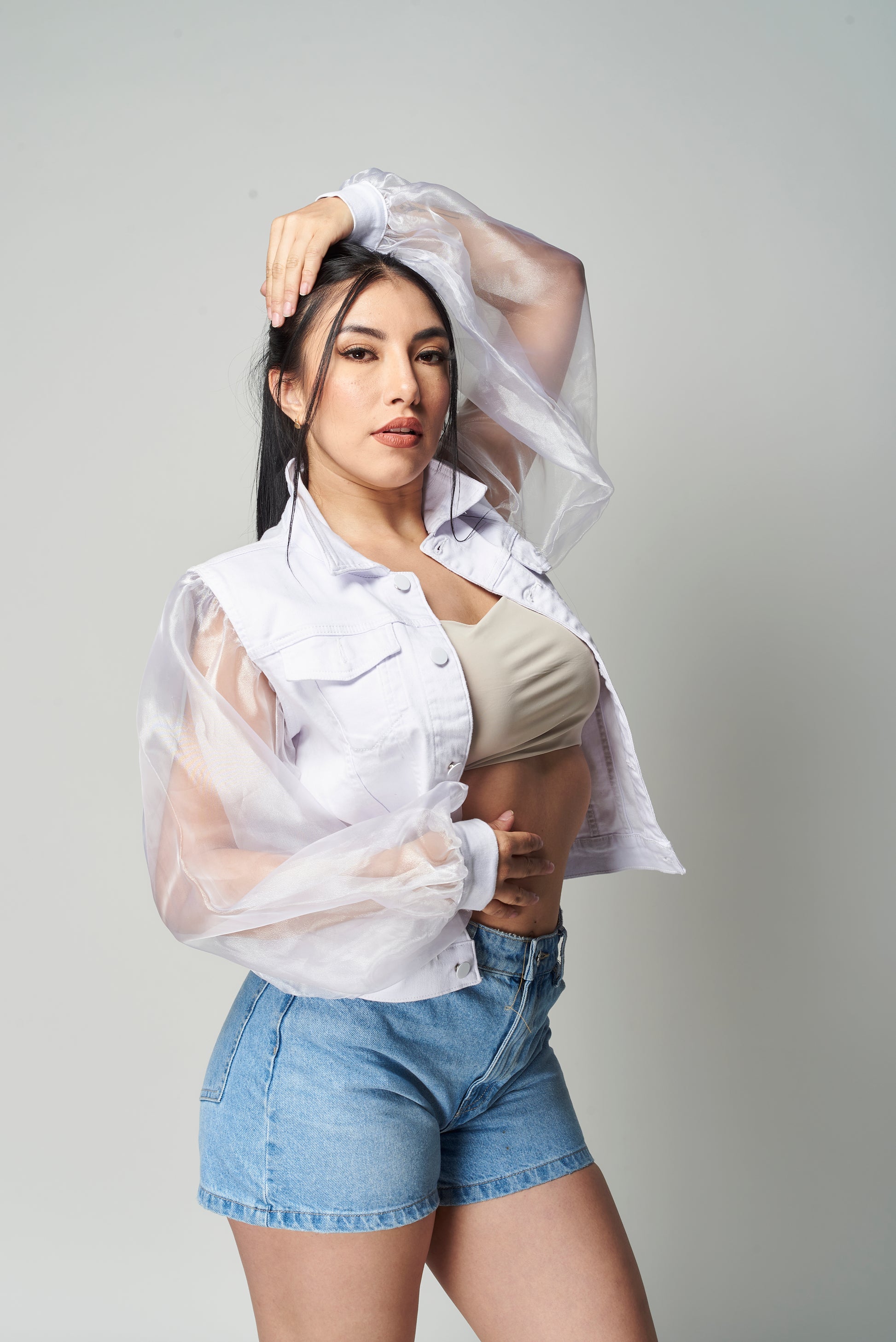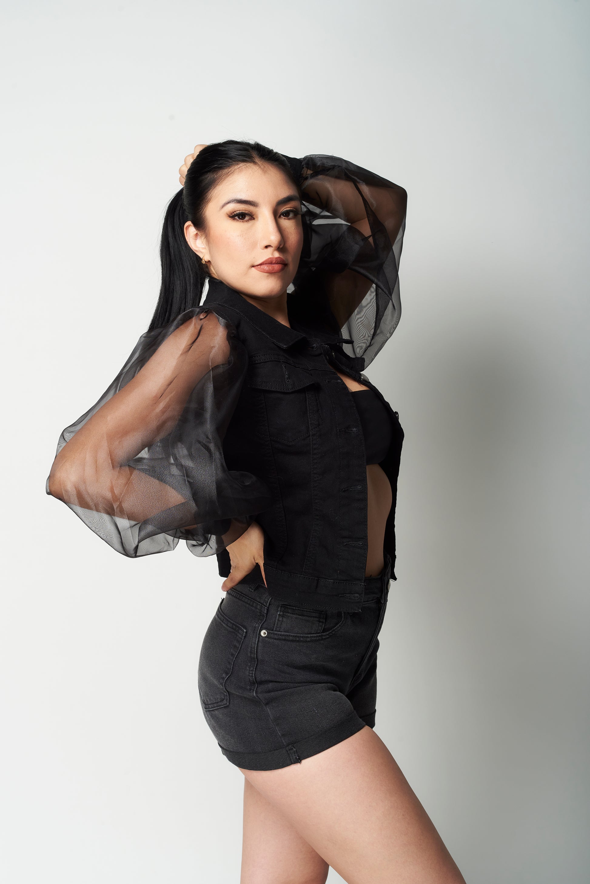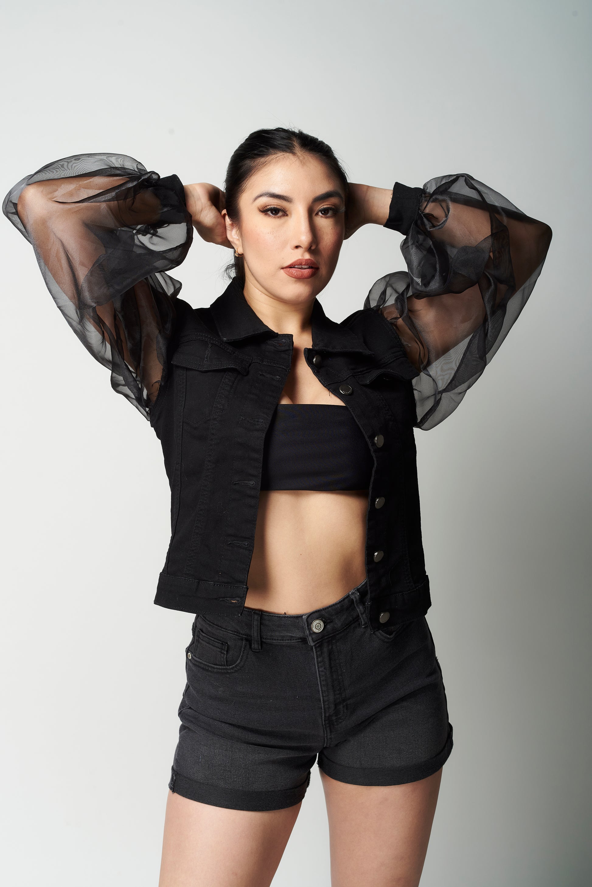 Rompe esquemas con esta chamarra que reinventa lo clásico. Su cuerpo de mezclilla te brinda estructura y firmeza, mientras que las mangas abullonadas de organza transparente elevan el look con un aire cómodo y femenino.