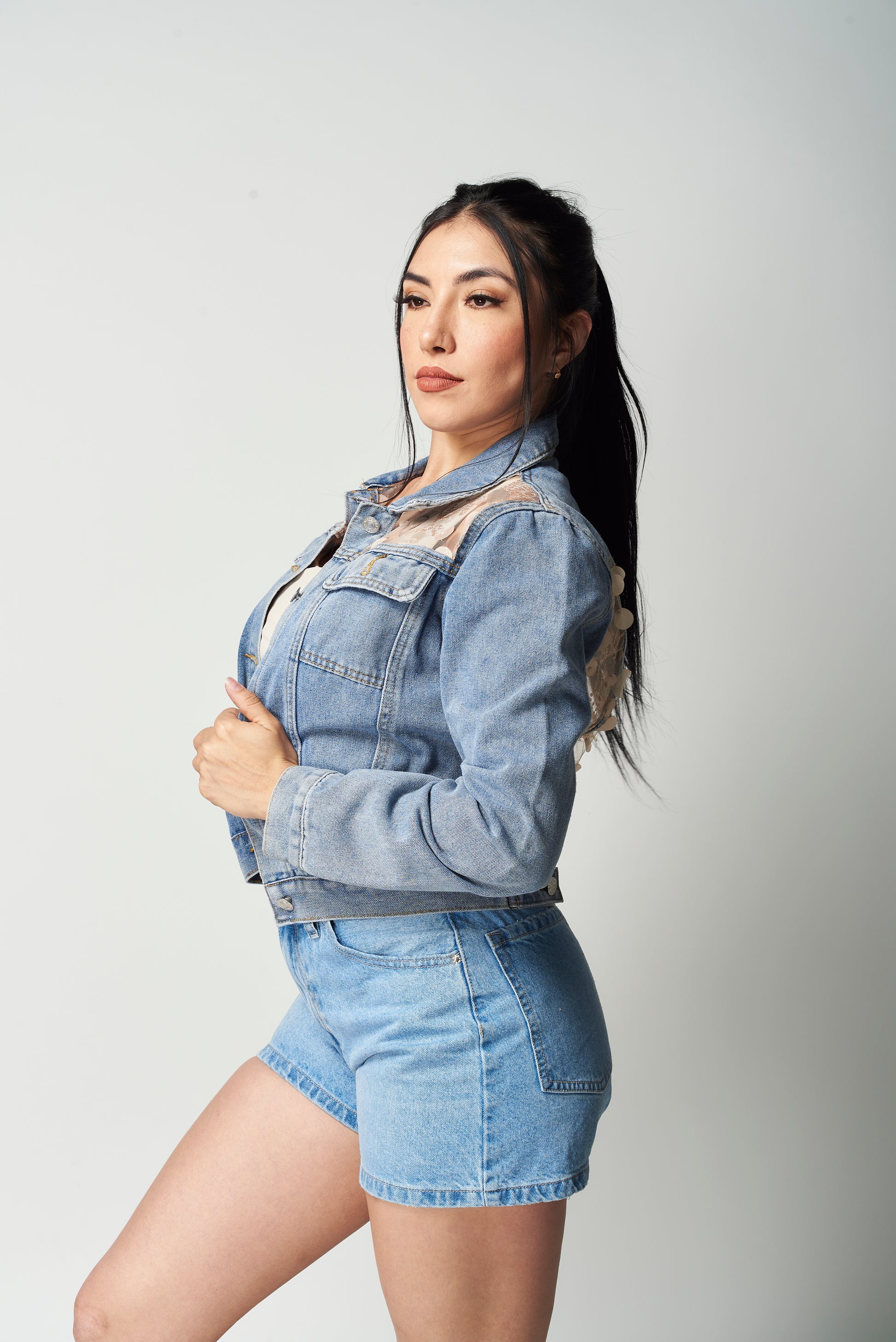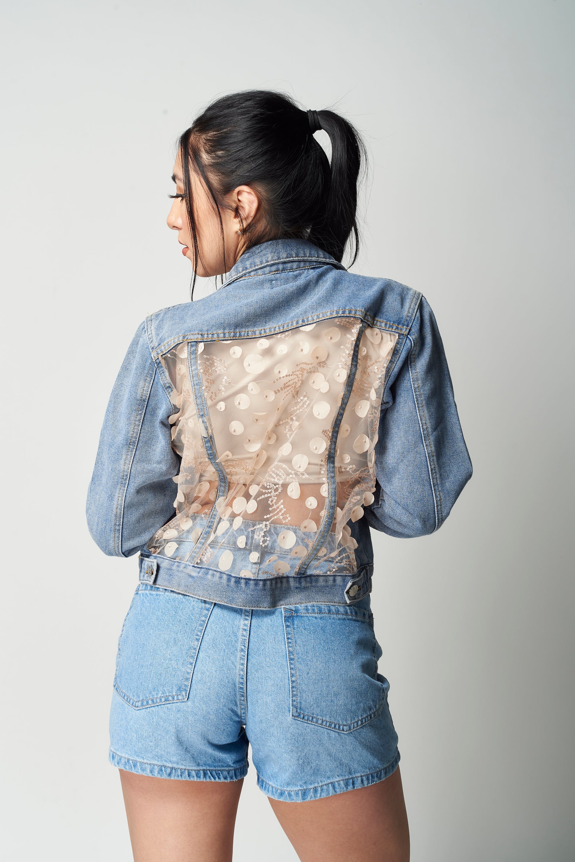 Dale un respiro a tu look con esta chamarra de mezclilla ligera, perfecta para brillar en temporada de calor. Su diseño combina la estructura clásica del denim con paneles de encaje nude y detalles circulares que no solo añaden un toque femenino, sino que también permiten mayor ventilación, haciéndola tan fresca como estilosa.