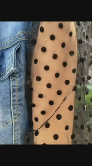 Rompe las reglas de lo común con esta chamarra de mezclilla azul elástica que combina lo mejor de dos mundos: la estructura icónica del denim clásico con la sutileza y romanticismo de unas mangas globo en malla texturizada con diseño de lunares. Un diseño único que convierte cualquier outfit en una declaración de estilo.