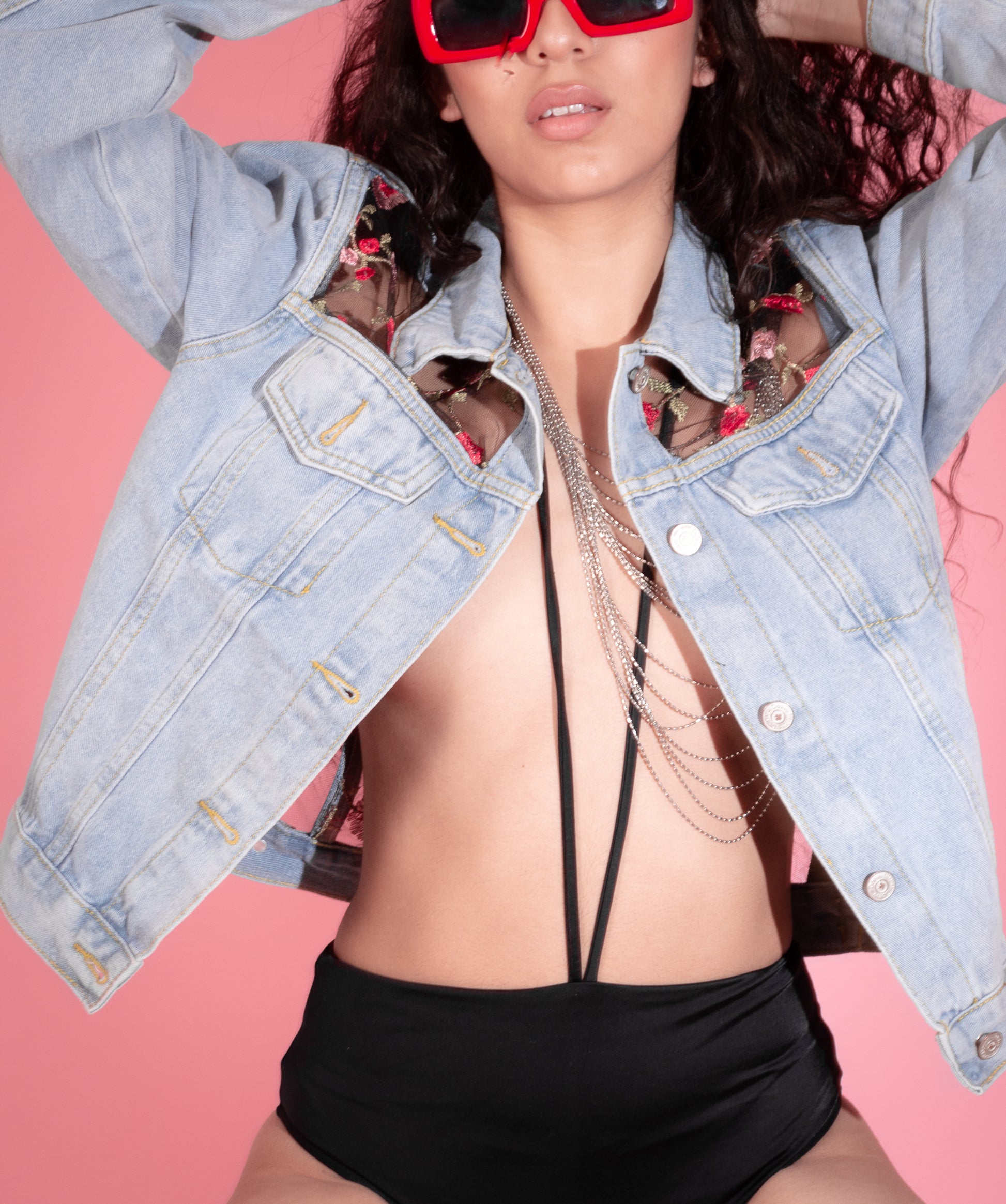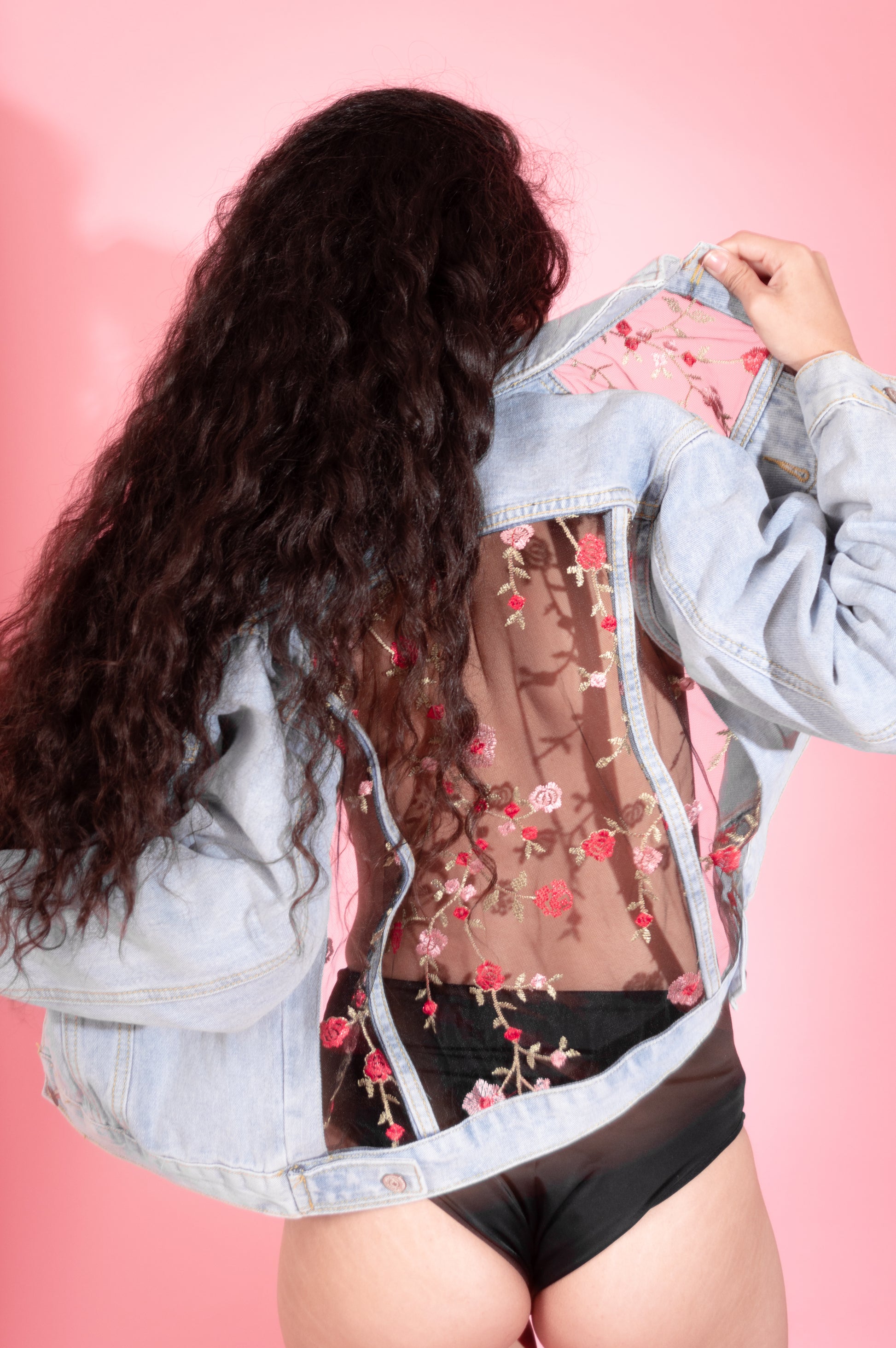 Reinventa tu estilo con esta chamarra de mezclilla azul que fusiona el carácter atemporal del denim con un toque romántico y atrevido. Su diseño clásico se eleva con delicados cortes de encaje floral bordado en la parte frontal y posterior, creando una pieza visualmente poderosa y ultra femenina.